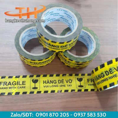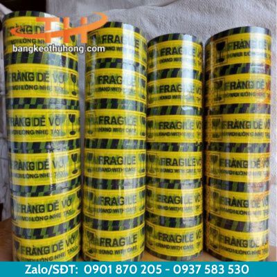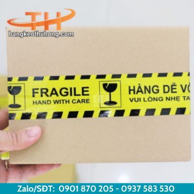 Về sản phẩm băng keo dán hàng dễ vỡ là sản phẩm được làm từ màng BOPP và keo nước. Vì đây là băng keo dùng để cảnh báo nên màu sắc của nó phải làm nổi bật so với các màu xung quanh, và màu mang tính cảnh báo, thường thì màu sắc của loại băng keo dán nền cảnh báo là màu vàng, màu xanh hoặc màu đỏ.